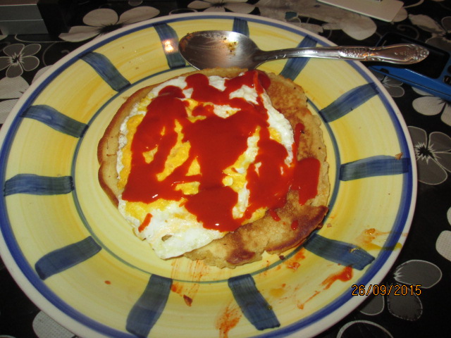 One morning I went all out. A pancake, fried egg, and Valentina salsa.